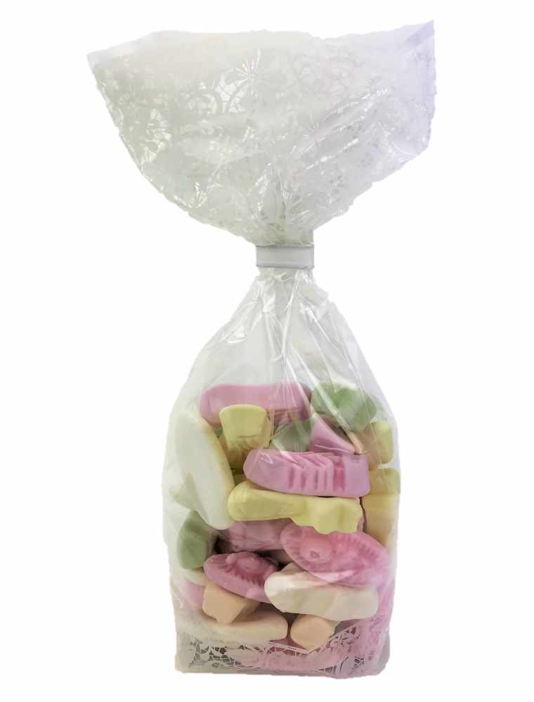 Ingrédients: Sucre, sirop de glucose, gélifiant : gélatine, acidifiant : acide citrique, arômes, colorants : E141, E162.