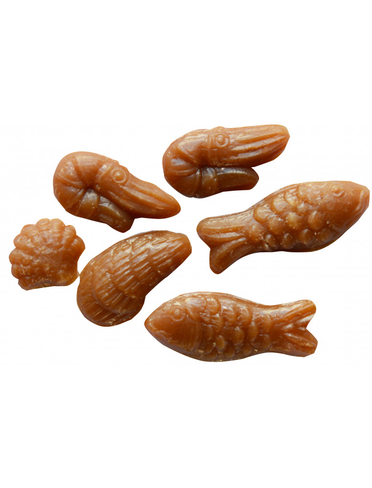 BONBONS NUS CARAMEL AU LAIT - Ingrédients : Sucre (UE) 41% - Sirop de glucose de BLE 28% (contient SULFITES) - LAIT concentré 28% - BEURRE 1% - Fleur de sel IGP 1% - Bicarbonate de sodium 1%.