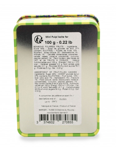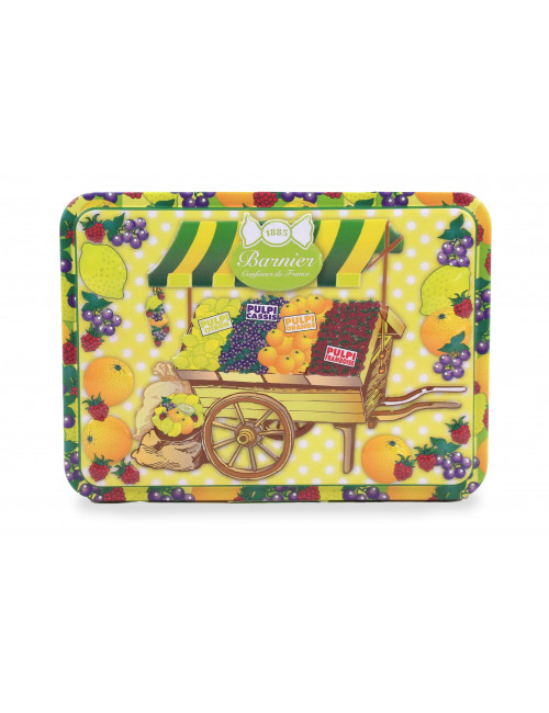 Carton de boîtes métal avec embossage remplie de mini bonbons fourrés fruits assortis - 100g
